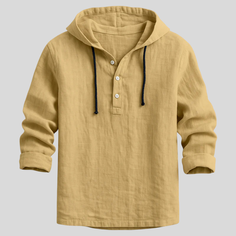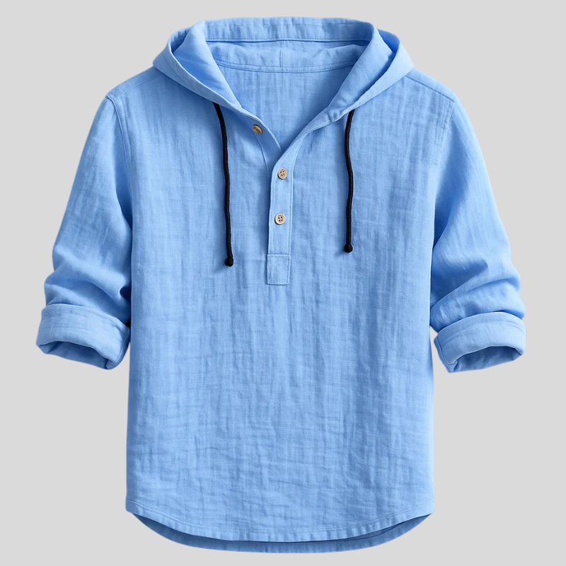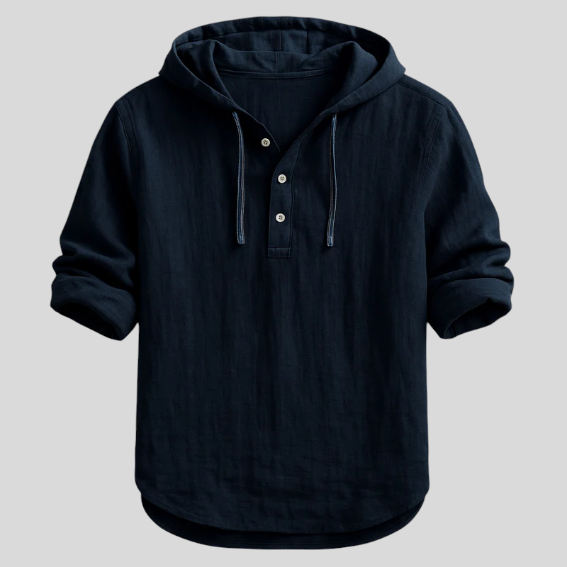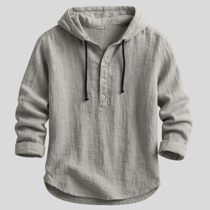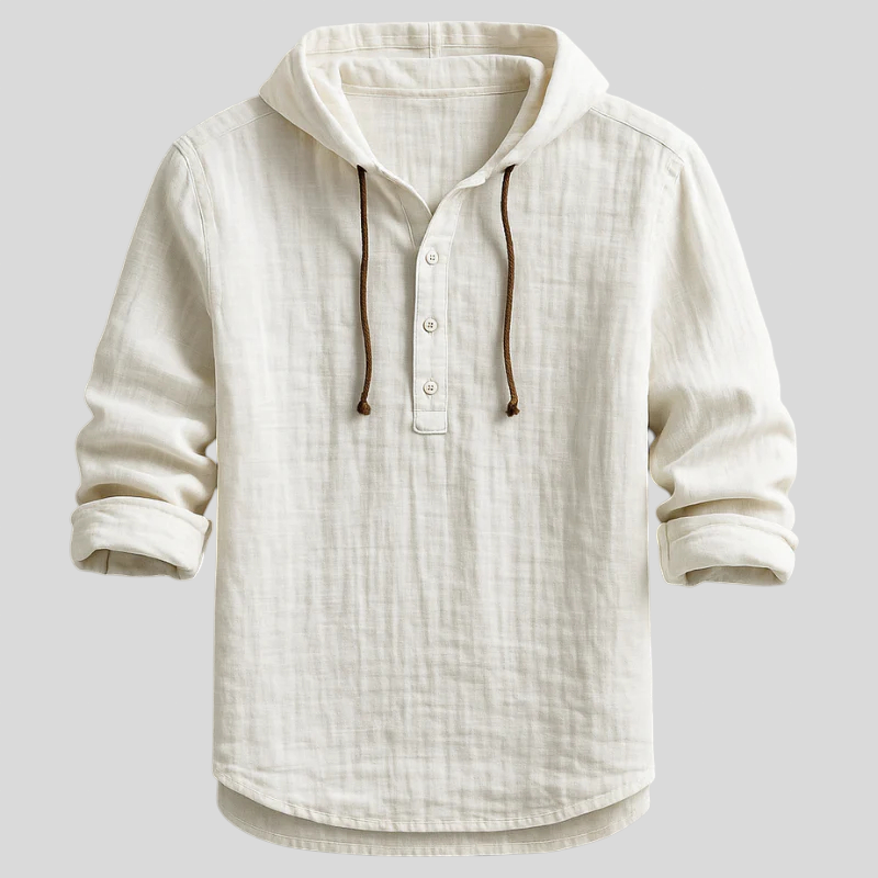 Komad koji spaja ležerno i dotjerano u jednom looku. S kapuljačom i vezicama, poluotvaranjem s gumbima u henley stilu, rukavima koji se lako podvrnu i zaobljenim rubom, ova lagana majica prirodnog dodira pruža izvrsnu prozračnost i opušten pad. Idealna za prijelazna razdoblja—nosite je samostalno ili slojevito, od ureda do vikenda, bez imalo truda.