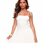 Lagano, ženstveno i bez napora rafinirano. Soft Muse Plisirani Mini ima strukturiranu korzet-stil gornji dio koji ističe struk, uparen s mekom plisiranom suknjom koja se kreće s gracioznošću. Delikatne vezice dodaju romantičan dodir dok omogućuju prilagodljivu veličinu. Dizajnirana u svježem bijelom tonu, ova haljina spaja eleganciju i udobnost za tople dane, brunch izlaske i trenutke zlatnog sata.