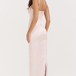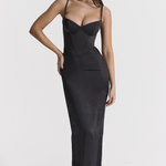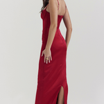 Haljina od satena Rubina karakterizirana je svojim rubin crvenim satenom s korzetom i čašama obrubljenim čipkom za optimalnu podršku. Asimetrični kroj elegantno pada, čineći je savršenom za večernje događaje, gala ili romantične večeri.