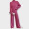 Ovaj set od canelirane tkanine idealan je za one koji traže moderan i udoban izgled. S majicom visokog ovratnika i hlačama širokih nogavica, pruža fluidan kroj, termalnu udobnost i sofisticirani dodir. Savršeno za dane odmora sa stilom, rad od kuće ili čak urbani casual izgled s tenisicama ili čizmama.